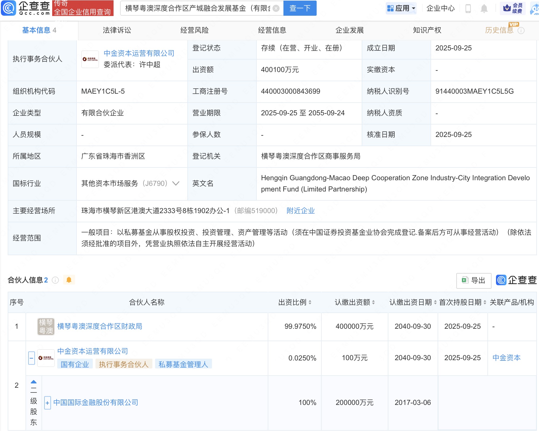 近日,横琴粤澳深度合作区产城融合发展基金(有限合伙)成立,出资额40.01亿人民币,经营范围为以私募基金从事股权投资、投资管理、资产管理等活动。企查查股权穿透显示,该企业由横琴粤澳深度合作区财政局、中金公司(601995)全资子公司中金资本运营有限公司共同出资。